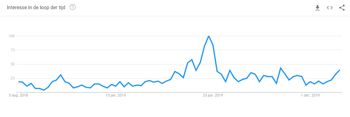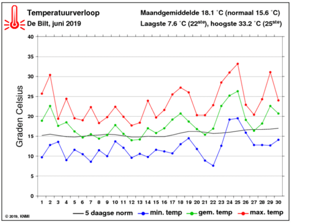 Der Juni 2019 war laut KNMI der wärmste Juni seit 1901. Das spiegelte sich auch im Interesse an Gründächern wider. Im Juni 2019 war die Nachfrage nach Gründächern doppelt so hoch wie im Mai 2019. Vor allem ab dem 20. Juni stieg das Interesse an Gründächern stark an, als klar wurde, dass die folgenden Tage tropisch werden würden.
